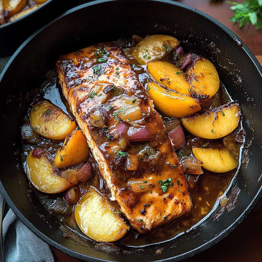 In summary, Bourbon Peach Roasted Salmon is a delightful dish that combines sweet and savory flavors effortlessly. By using fresh ingredients like ripe peaches and quality salmon, you create a meal that impresses family and friends alike. The quick cooking time makes this recipe suitable for busy weeknights while still providing gourmet appeal. Whether served with roasted veggies or a refreshing salad, this dish will surely become a favorite in your home kitchen!