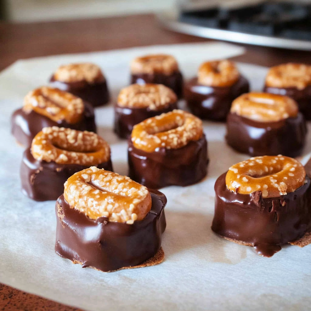 Dip in Chocolate: Carefully dip each filled pretzel into melted chocolate using forks to coat evenly. Allow excess chocolate to drip off before placing them on parchment paper.