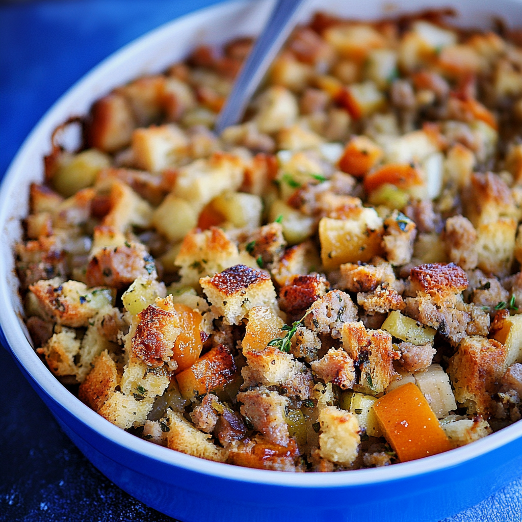 Enjoy the satisfying crunch of that golden topping paired with moist stuffing bursting with flavors of sage, apple, and savory sausage. Pair this dish with roasted turkey or serve as a stand-alone delight at your next gathering!